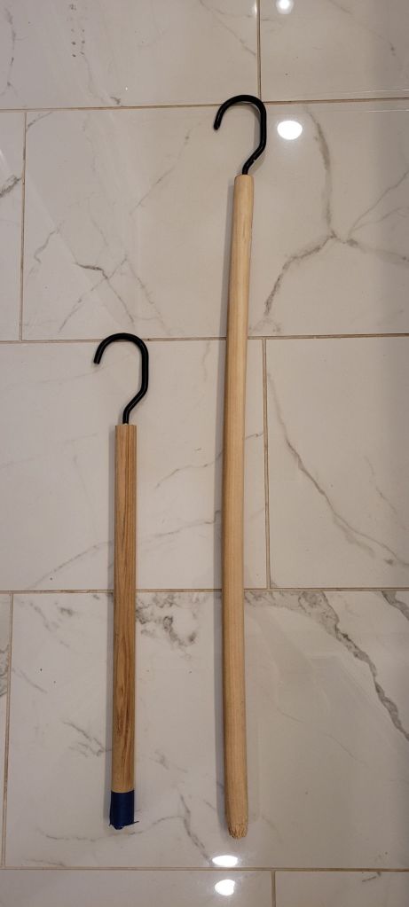 One thing I needed was a way for me to flip up my wheelchair footrest. I could not find a sturdy enough pole with a hook the right length, so I designed one. A son built it from a wooden rod and a bike storage hook. From the left over rod, he built me a second longer hook for longer reaches.